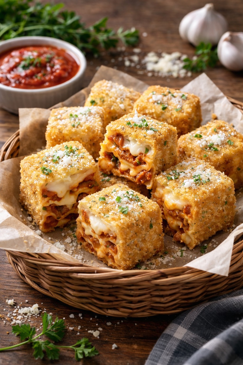 Deze Lasagne Cubes zijn gevuld met lagen pastadeeg, rijke bolognesesaus (38%) en romige mozzarella, omhuld met een goudbruine, krokante coating voor de perfecte bite.