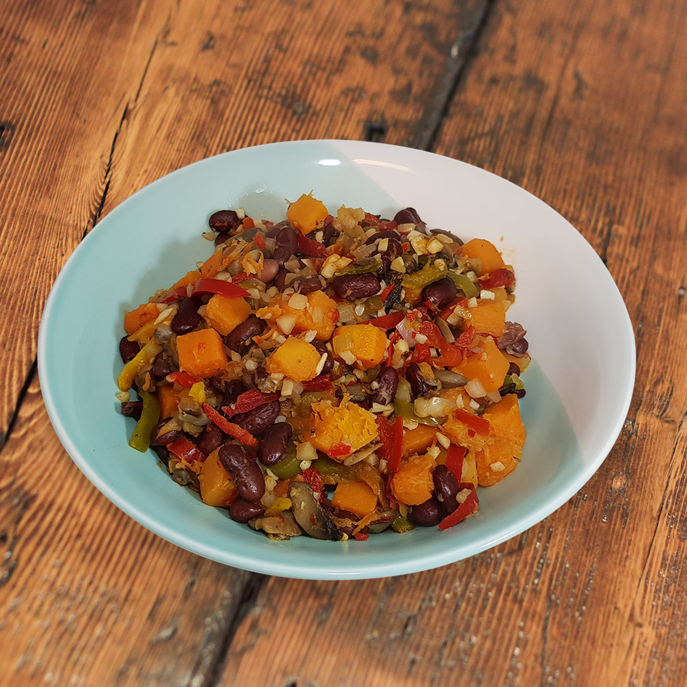Verhit in een wok PAM/Kokosolie en bak hier de Knoflookblokjes, Uienblokjes, Rode Chiliblokjes, Paprikareepjes, Champignons, peper en zout in. Voeg de Kidneybonen en de Pompoenblokjes toe en bak deze mee.